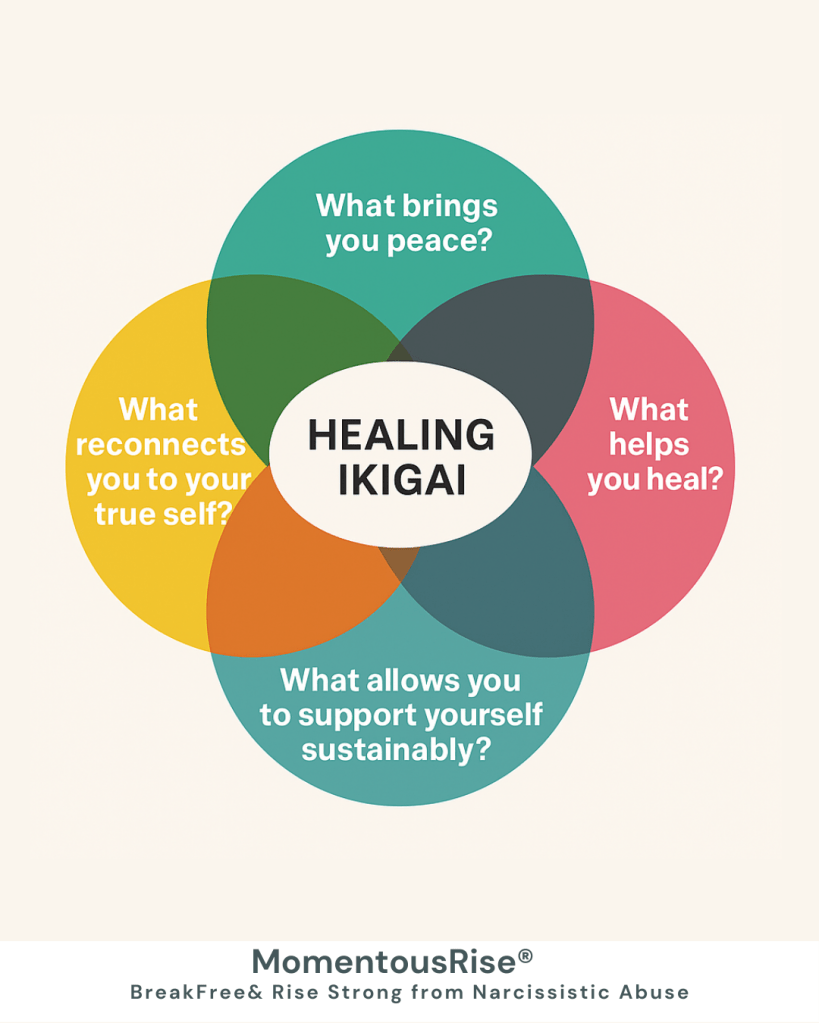 Inspired by the wisdom of the Ikigai model, at MomentousRise, I created ‘The Healing Ikigai’ a survivor-centered version for those reclaiming identity after narcissistic abuse. It’s not about going back to who you were… it’s about growing into who you were always meant to be. Healing, purpose, and peace can coexist. This framework helps you find them.